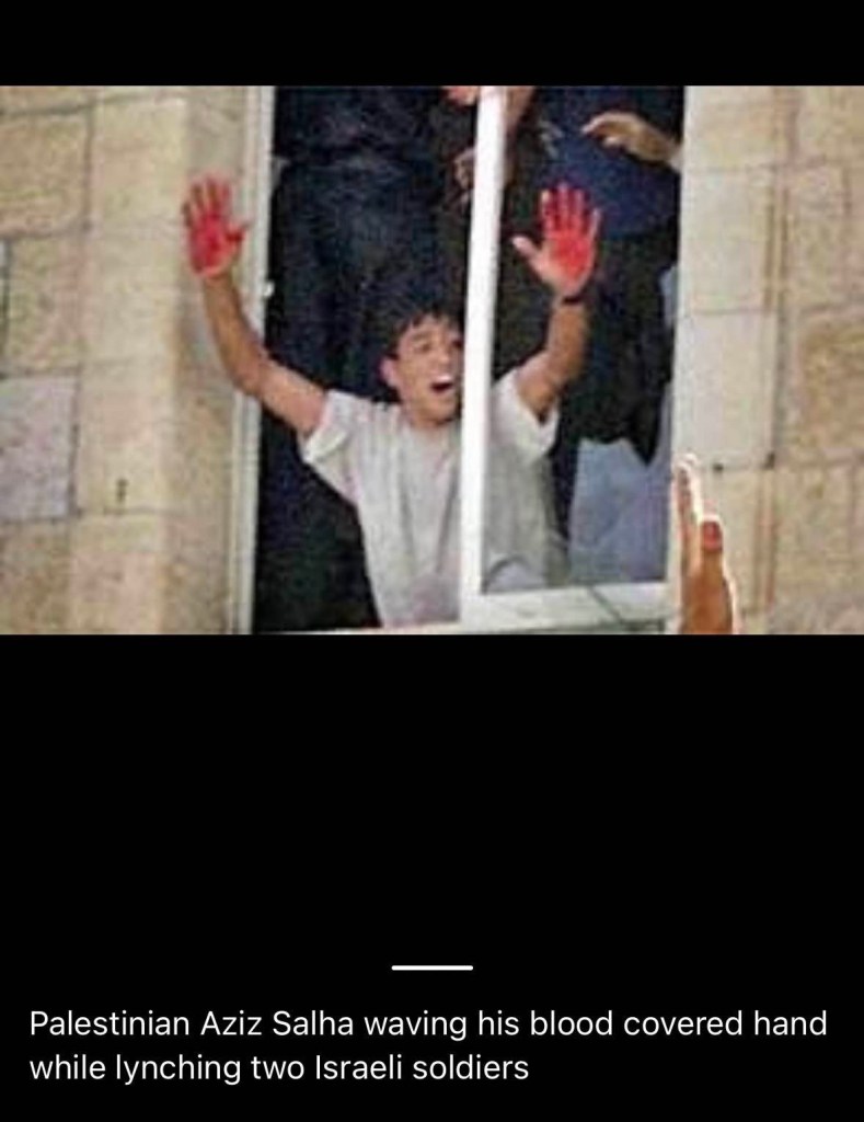 After members of a local militia dragged the men from a local police station where they’d been detained for getting lost, the militants beat, dismebowled, and lynched them. A famous photo captured militant Aziz Salha who lifted his hands up to the cheering crowd: his hands are covered in an almost cartoonish amount of blood as though it’s protest makeup instead of the blood from the violent lynching of two Israelis.