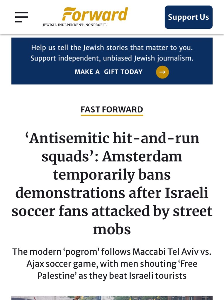 The first four words of the headline signal to the reader the main point of the piece — and it’s not violence against Jews but a scuffle between sports fans. By opening with a generic reference to sport fan violence, the article suggests to readers the key takeaway is “humdrum football clash between rivals.” Countries where football is popular are primed to understand sports violence happens; it’s not necessarily racially driven. By framing the pogrom in this way, journalists delegitimize violence against Jews before readers even get to the article. In contrast, notice the first five words in this Forward headline and how it changes the framing of the event: “antisemitic hit and run squads”.