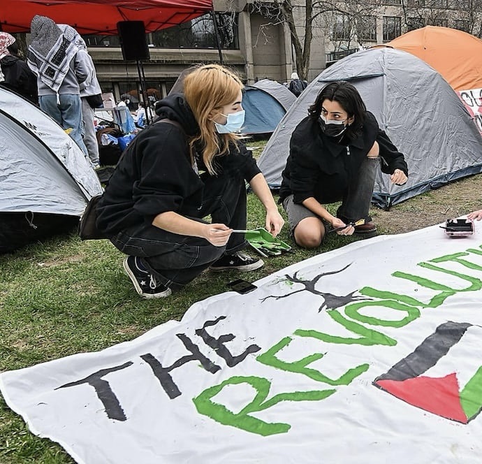 You know you don’t have to take a class from that Zionist pig, right? You’re paying through the nose to go to this school. You shouldn’t have to financially support white supremacists. Hand me that brush. So, basically Zionism was a European Jewish movement in the 1800s to ethnically cleanse Palestinians from their land. Yeah, I didn’t know at first either. Be careful spreading the red. And not just that but it’s continuing to this day. The entire country is de facto Zionist, and Israel has been committing a 76 year old genocide of the Palestinian people. Yeah, it’s every citizen because did you know that all Israelis serve in the IOF, which by the way are killing babies as we speak. The IDF isn’t a defense force. They are cops enforcing the occupation. Hence the, yeah, the Israeli Occupation Forces. Hmm, do a second black coat on the Divest. And every single Israeli serves. I knew you were going to say that next. No, see those Palestinians are not really Israelis because Israeli Palestinians have no rights in Israel. That’s why it’s an apartheid state. Here, help me carry it to the tent. Those Knesset members are just the token Palestinians Israel is using to distract the public from their genocide. Besides, anyone helping the enemy is a Zionist collaborator. Every Israeli baby born can do so because of the resources Zionists have stolen while living on the land they stole from Palestinians, so yeah, they’re Zionists. I think I said that already. I guess if they renounced their Israeli citizenship. But do they still have family there? Careful, careful, the paint is still wet. Well, then they’re Zionists. Current spouses are Zionists. Exes are tricky. Are they still close to the former Zios? And if not, do they loudly repudiate them in public? Then they’re not Zionists. Everyone else is. Well, are there any Israelis at the synagogue? See, that’s them weaponising the Holocaust. So what if she’s an 86 year old survivor? She’s from Israel. Literally from the time when the Nakba happened. If they’re inviting Zionists like that they for sure support Israel, and if they support the colonizer they are complicit in the oppression of Palestinians. Hiding behind religion. Pin it at the corner. No, no, I have to stop you there. The two state solution is just a lie Zionists use to pretend they care. If your friend said that it means she supports Israel. That’s not the point — are we supposed to thank her for being against Zionist aggression? The fact she thinks Israel has a right to exist at all says everything. Honestly, even acknowledging Israel is Zionist because in acknowledging it you are helping normalise Israel’s butchery. It isn’t even a real country. Ahmedinajad said it best, Israel is a cancer, an entity, the Zionist Entity.
